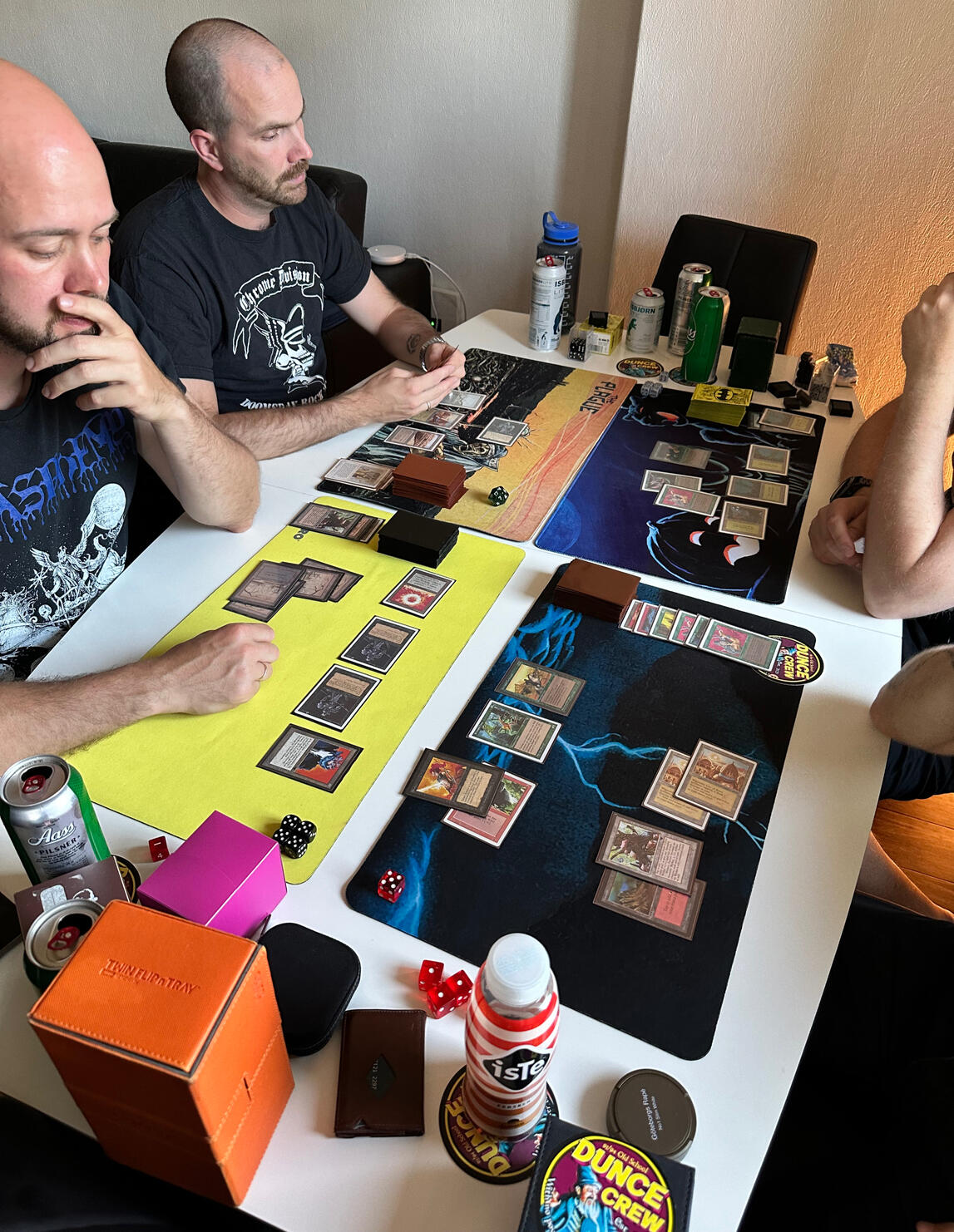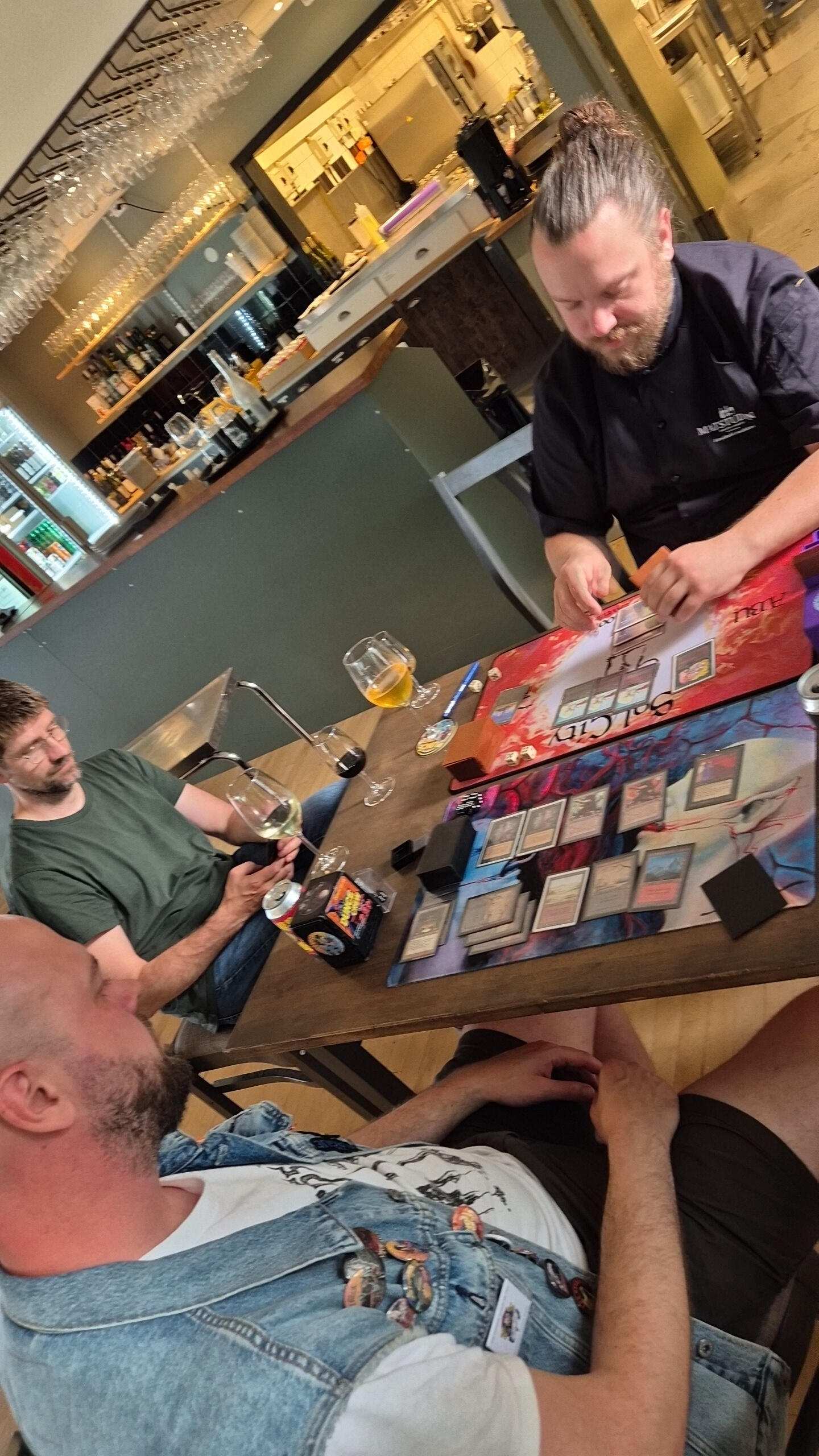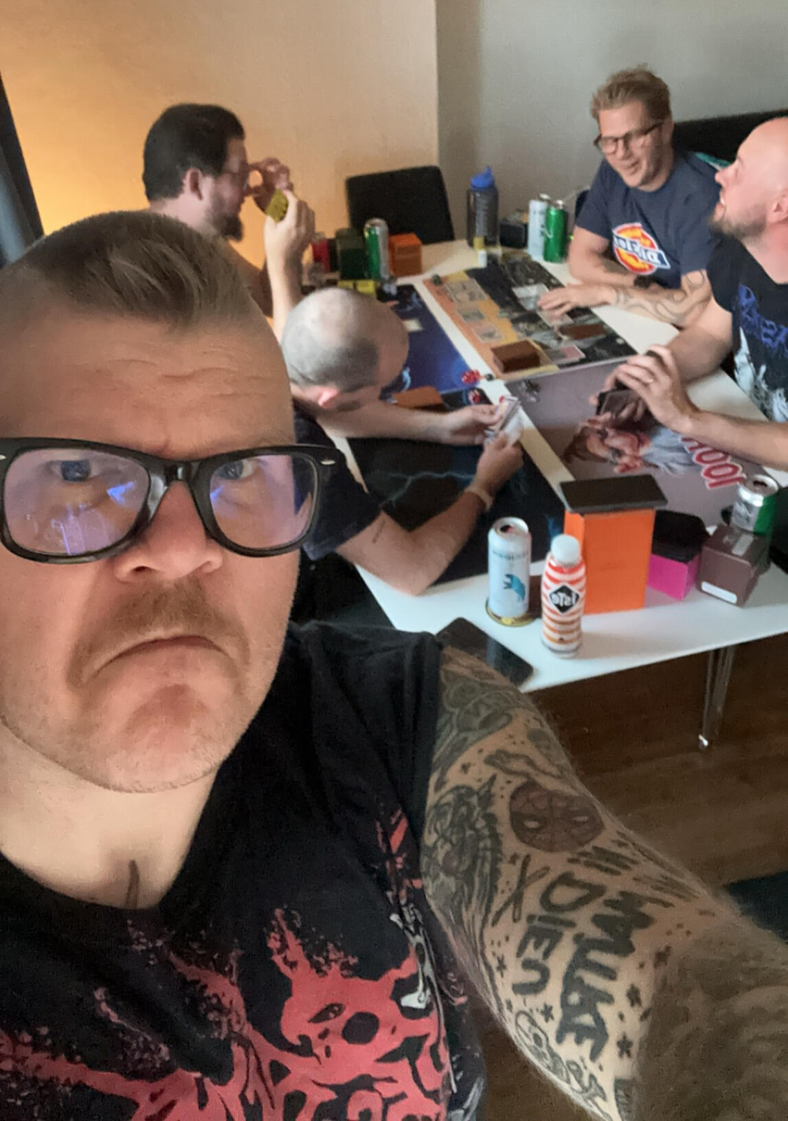 Eyvind, Joakim, and Magnus II were scheduled to compete in the Team Unified Championship under the banner The Dudes of Dunce, while Adrian, Magnus I, and Vincent - being Elders, after all - attended strictly for the Gathering itself: Observing in quiet dignity while mumbling judgmental observations based on nothing substantial.Arrival in Arvika was followed by the customary uphill migration to the hotel, decks and luggage in tow. Check-in was handled efficiently, after which attention turned, as tradition demands, to Systembolaget, a uniquely Swedish establishment purveying alcoholic beverages.Midway through the first beer at the hotel bar, Sindre appeared several hours ahead of schedule, having opted to drive rather than take the originally planned train. He was clearly excited - having also been promised all of Eyvind’s Power during the main event on Saturday. While the Team Unified Championship kicked off, the remaining members located a local pizzeria. The shrimp-heavy menu was navigated with deliberate caution — memories of the Pizza Incident of Istvan Open still lingering — but food and beer were ultimately secured without incident.
