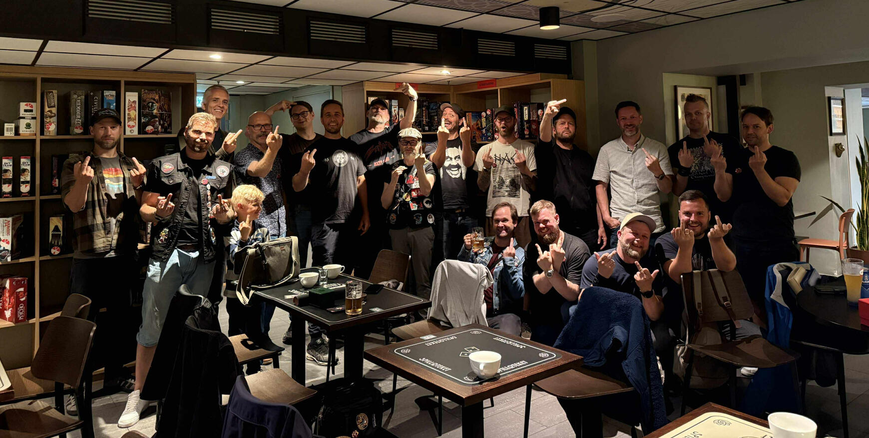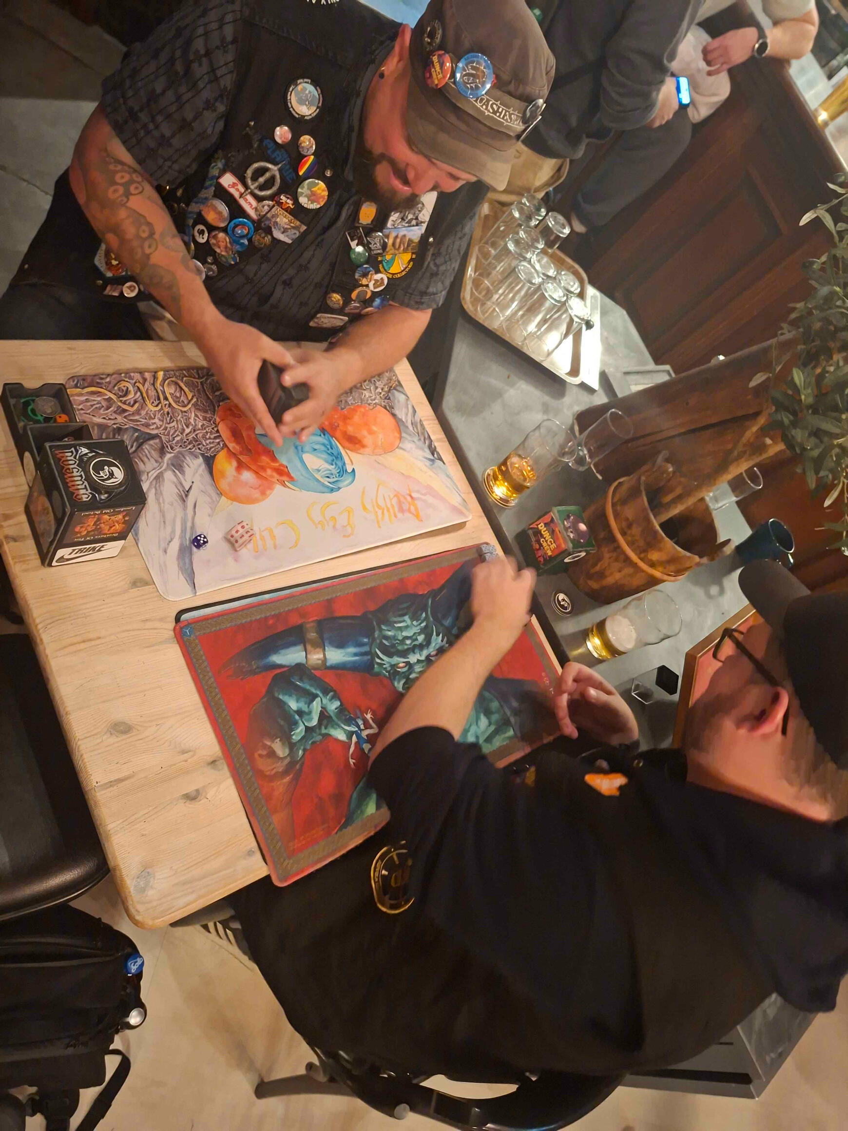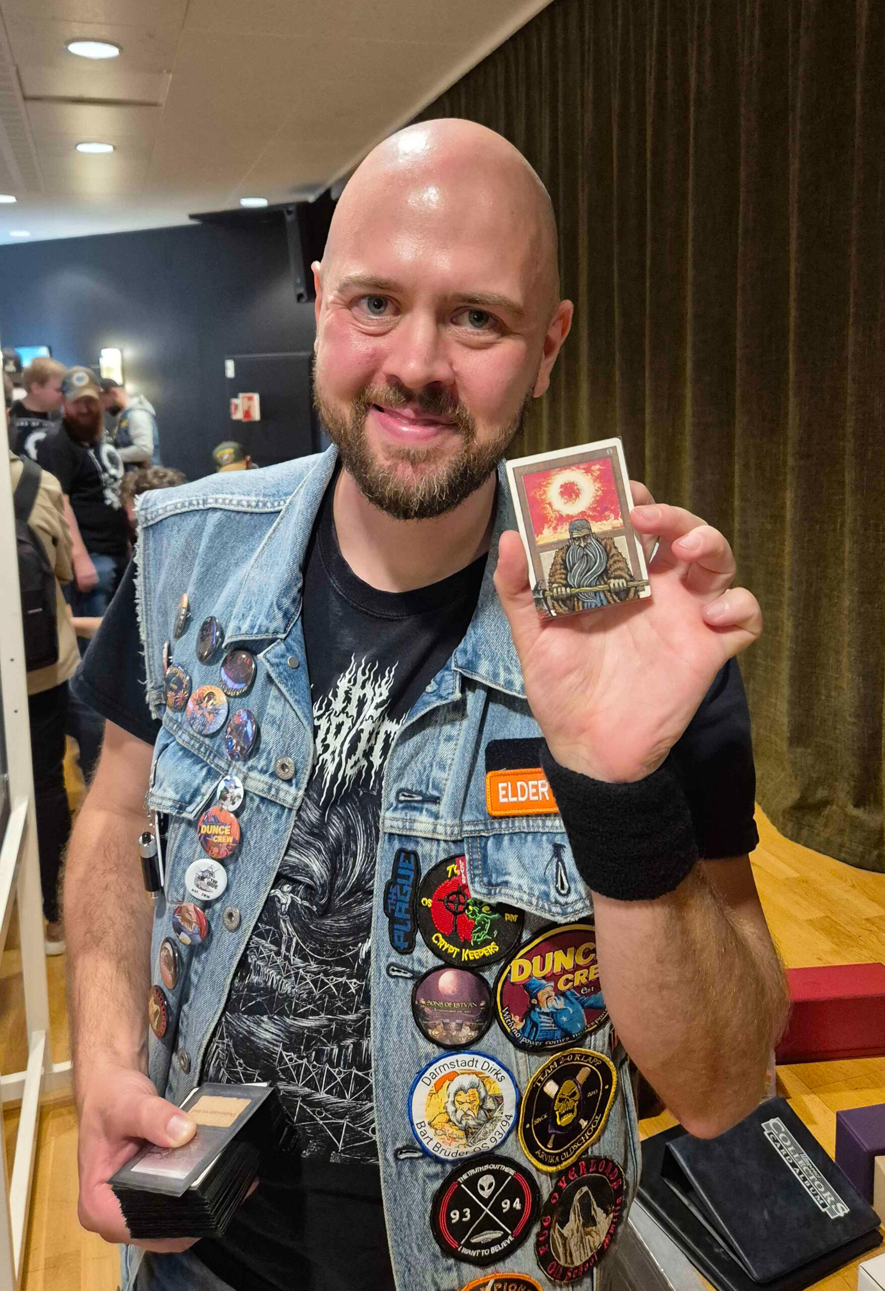 The venue contained aa plethora of familiar faces to greet, and the atmosphere was, as always, exceptional. The Dunce merchandise that was brought along for handing out turned out to be popular among the other players, suggesting either strong branding or low impulse control among attendees. Possibly a combination of both, knowing the Old School Scene.At the bar, Steinar appeared, a friend of the gang, and an all round solid guy. Steinar has expressed interest in membership in the exclusive club of Dunces lately, brought with him several cards for the Crew as a form of obeiscance, but also the prize for the internal Crew League - a booster from the Dark traded for cold, hard cash. Several previously held extraordinary board meetings concerning his membership (conducted with suitable gravity), resulted in a formal invitation being extended.Steinar accepted graciously, visibly pleased. The crew thus welcomed its newest Apprentice Dunce. Whether a trace of hesitation crossed his face during the handshake with the Supreme Leader remains a matter of interpretation. A group photo was hastily assembled, and shortly thereafter the event commenced.
