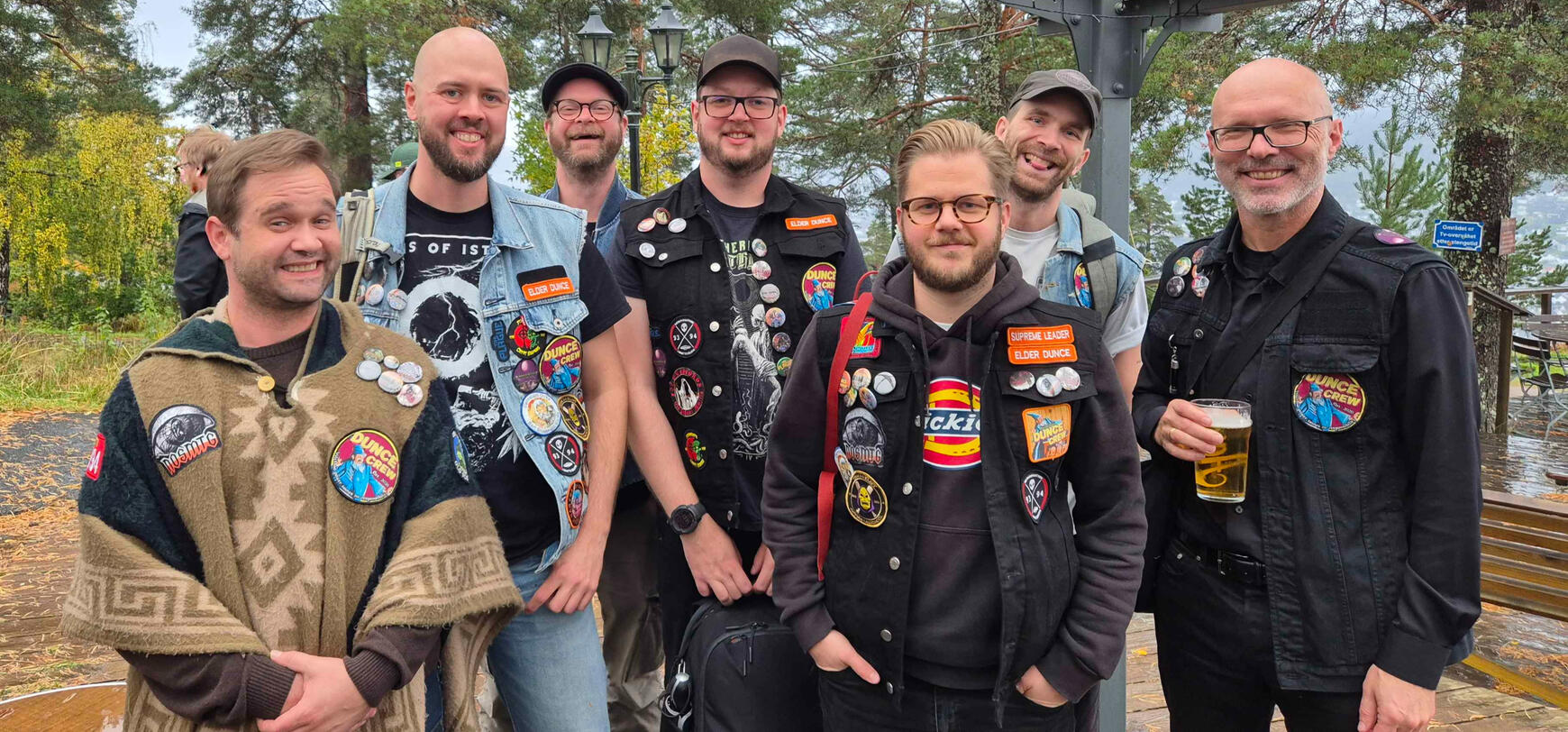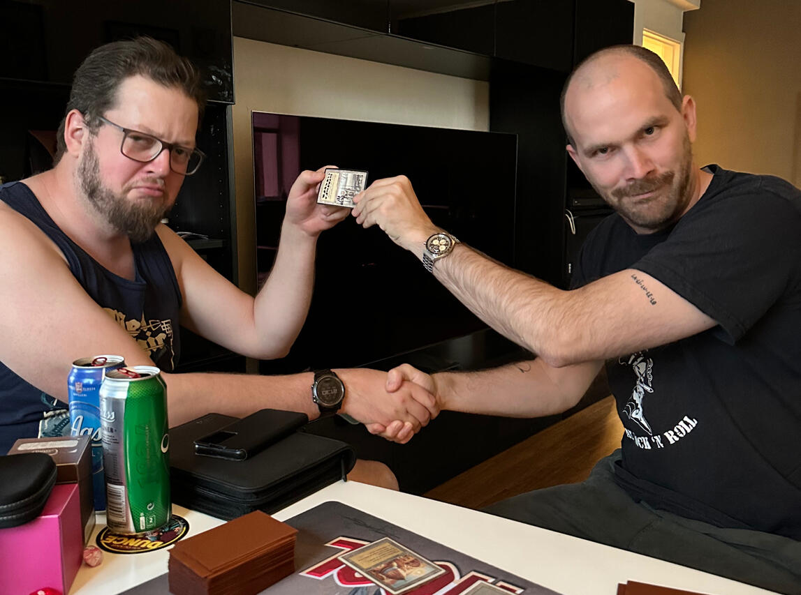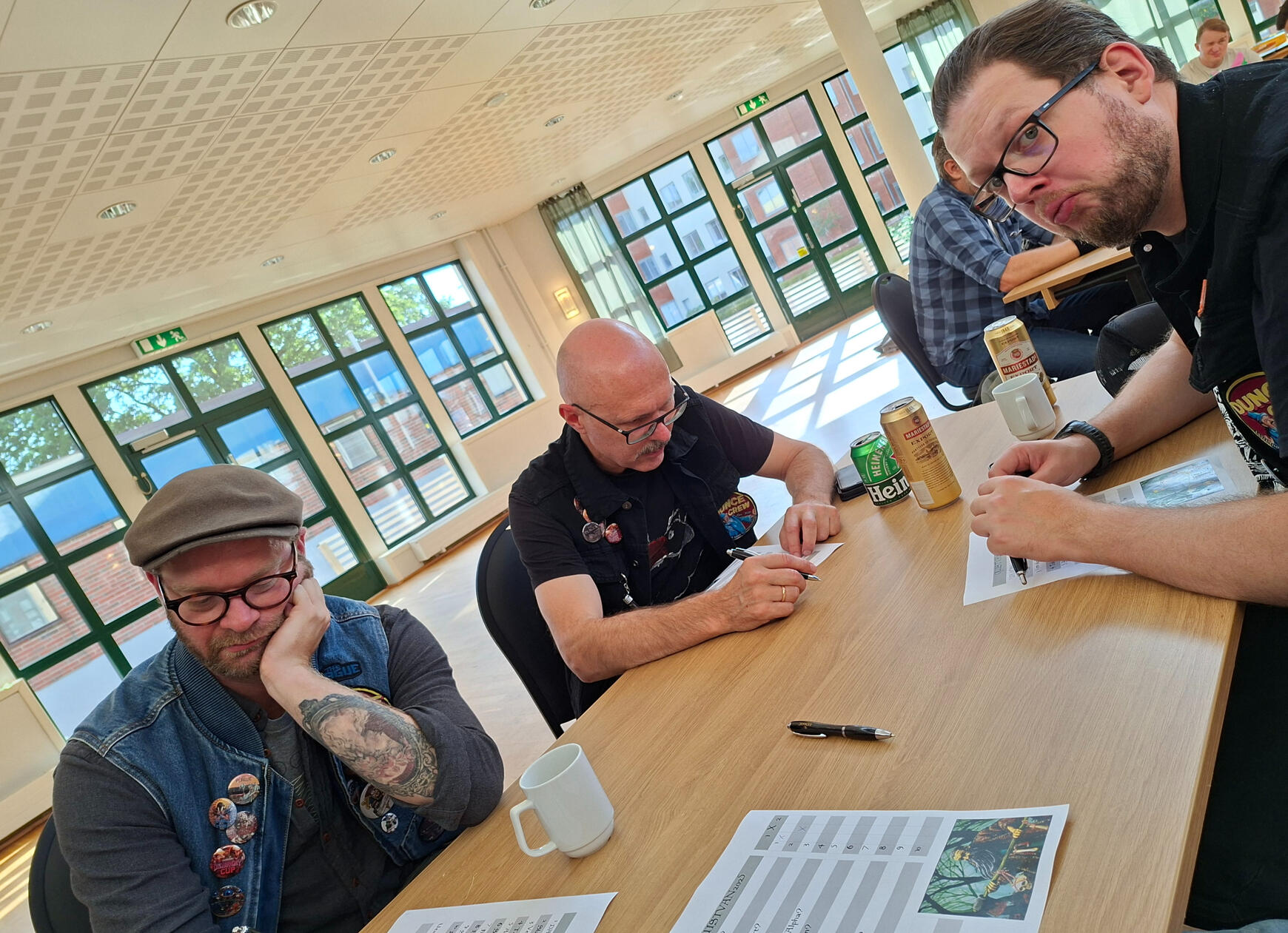 The venue contained aa plethora of familiar faces to greet, and the atmosphere was, as always, exceptional. The Dunce merchandise that was brought along for handing out turned out to be popular among the other players, suggesting either strong branding or low impulse control among attendees. Possibly a combination of both, knowing the Old School Scene.At the bar, Steinar appeared, a friend of the gang, and an all round solid guy. Steinar has expressed interest in membership in the exclusive club of Dunces lately, brought with him several cards for the Crew as a form of obeiscance, but also the prize for the internal Crew League - a booster from the Dark traded for cold, hard cash. Several previously held extraordinary board meetings concerning his membership (conducted with suitable gravity), resulted in a formal invitation being extended.Steinar accepted graciously, visibly pleased. The crew thus welcomed its newest Apprentice Dunce. Whether a trace of hesitation crossed his face during the handshake with the Supreme Leader remains a matter of interpretation. A group photo was hastily assembled, and shortly thereafter the event commenced.