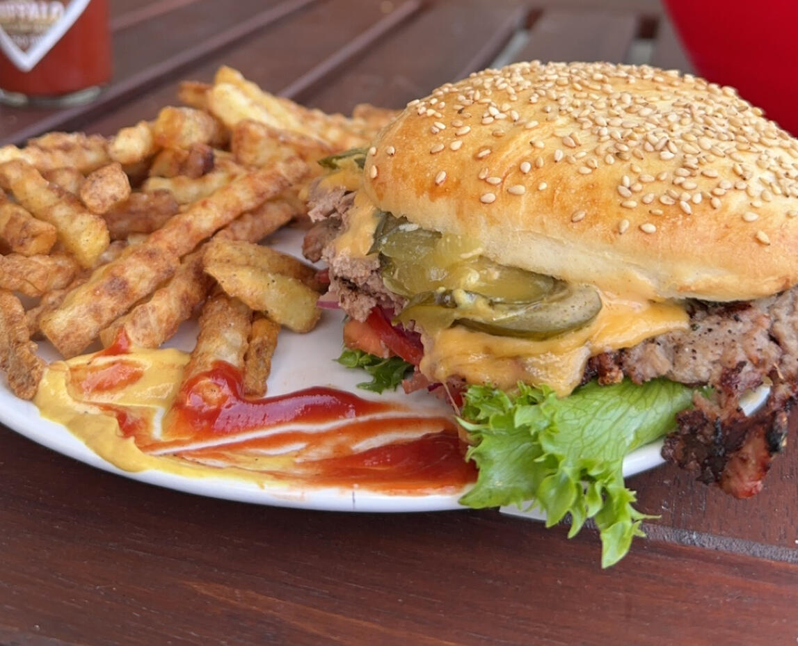 Homemade burgers pounded so flat that you had to put two on top of each other to approximate a burger.