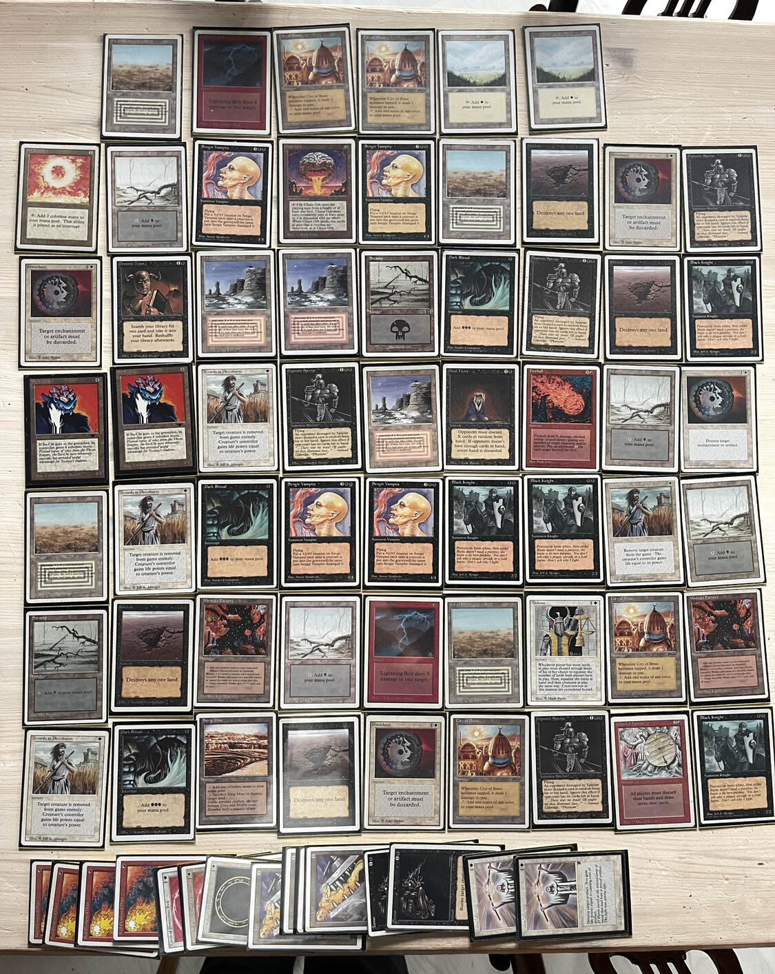 The other guys fared a bit better, but not much. Adrian faced The Deck (0-2), Land Tax/Ivory Tower Combo (2-1), Mono Blue Flyers (2-1) Counterburn (1-2), Four Colored Tetravite/Keldon Warlord (1-2) and Green/Black Land Destruction (1-2), ending up 2-4, but claims he had many close games. He also blames his somewhat hungover state of mind, but adds that that’s the price you pay for having fun, which is his cost/benefit analysis. He also commends all the pleasant players he faced, the cheap beer and the excellent food. A not insignificant win for Adrian was however the fact that he managed to save my Beta Bolts from my deranged defacement plans, and trade them against the two Plateaus I needed for the playset, a playset of Unlimited Bolts and some cash. The disturbance in the force Adrian has been sensing has been rectified, and I still get to deface four Bolts.