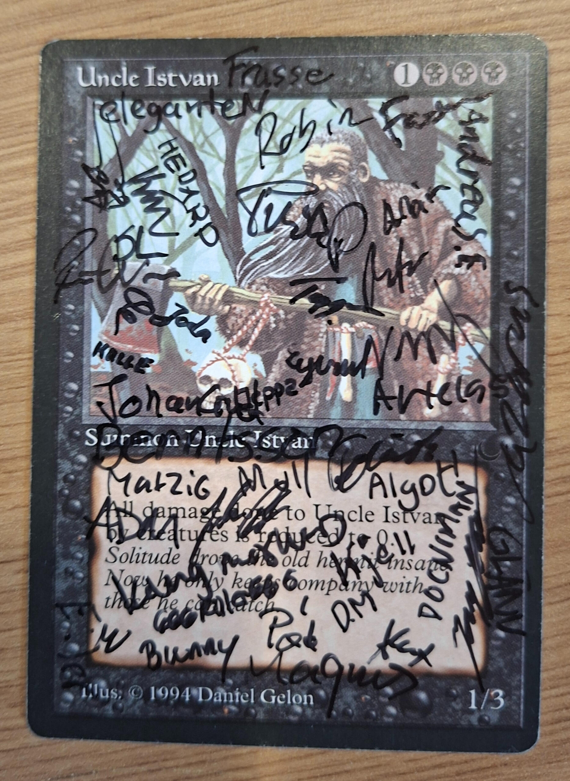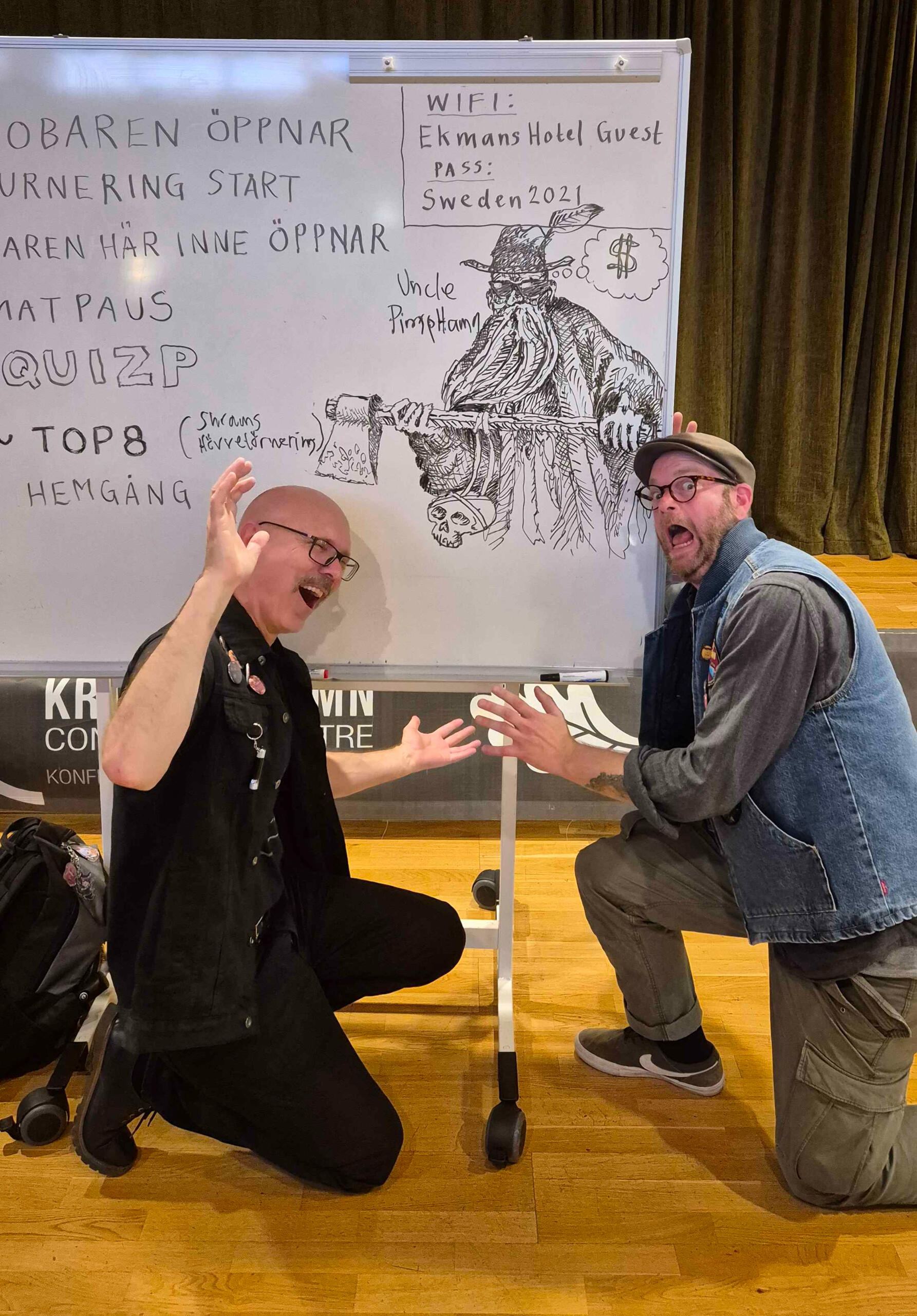 Five valiant idiots of the Dunce Crew embarked on their grand pilgrimage to the MTG Old School Tournament in Arvika, Sweden, aboard a train that became a rolling feast of sausage, beer, and the noble art of Orb Flips. After arriving in Arvika with bellies full and pockets slightly lighter, they checked in at the tournament, only to be greeted by the ever-persistent Mitja, who met the idiots at the exact right time to coax gold from the crew’s collective wallet (which to be honest is all hours of the day), as well as Living Legend and Magic Artist, Anson Maddocks. Cards were signed, playmats were purchased, and the scent of commerce filled the air.Then, the mighty Magnus The First and the equally mighty but not-so-named Magnus The Second were summarily defeated by Norton—an outcome that hardly seemed to dampen their spirits, for more beer was procured and games of dubious skill ensued while they waited for their final member, Sindre, to grace them with his presence. When Sindre finally arrived, the crew retreated to an Indian restaurant, where over the warm glow of tandoori, Sindre unveiled his grand plans for a future event in Voss, Norway, and plenty of great ideas were exchanged over the spicy food. However, much like any good idea nurtured under the influence of alcohol, it was likely lost to the ether as no one had the foresight to write anything down.The night stretched into the early hours with more games, more trading, and a casual spectating of the Ante40k event, where Dunce-friend Steinar stole the show with his sheer audacity. Saturday dawned with four of the five crew members feeling the full brunt of their previous excesses. Magnus The First, eyeing the Supreme Leader Patch with a mix of longing and despair, led the charge to find provisions, in the form of nuts and whatever else would sustain them until the evening.The tournament, long as it was, could be summed up thusly: Vincent and Sindre engaged in a fierce battle for the coveted Dead Last position, but neither of them managed to claim the prize (in a repeat of last years heroic attempt at the same by Daniel). Adrian and the Magni (plural of Magnus) performed commendably, even reportedly ending at 10th, 9th and 8th in the ranking of Unpowered decks, but it was Magnus The First who claimed the prestigious title of Supreme Leader as highest ranking Elder Dunce, while Magnus The Second, highest ranking Dunce (but alas, not eligible for the Supreme Leader Title as he is of the non-elder variety according to the Crew Magna Carta) earned the title of Least Dunce, a crowning achievement in its own right. His not-so-Dunce-like efforts can be seen 8 hours 29 minutes into this stream: